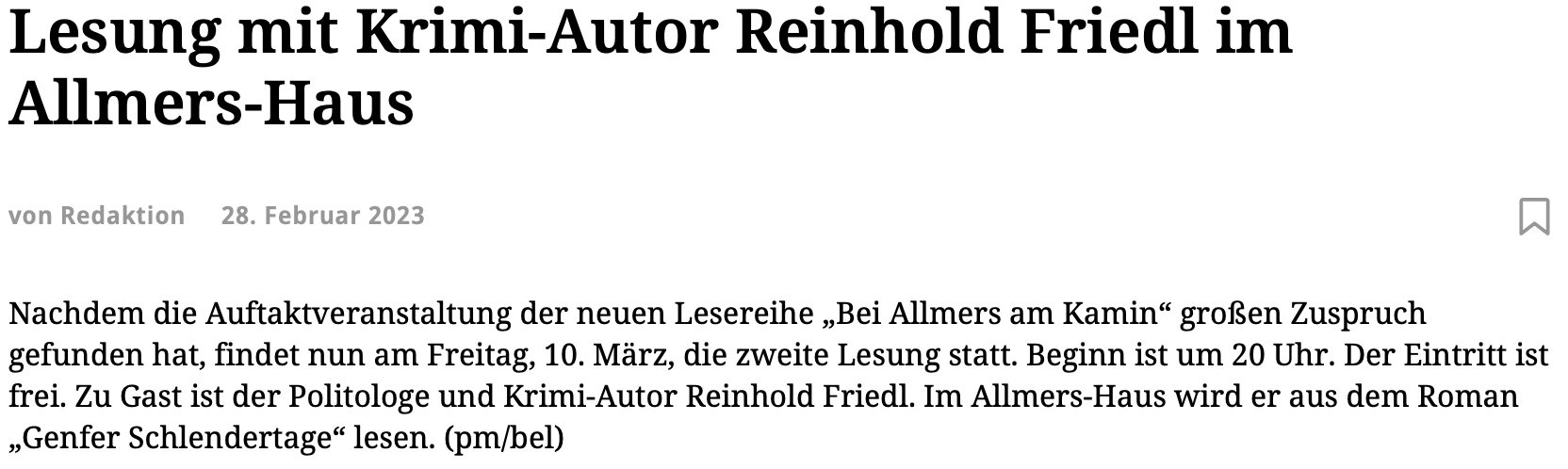 Kürzlich war der Oldenburger Autor Reinhold Friedl zu einer Lesung aus diesem Krimi beim beim UNO-Literaturclub in Genf eingeladen. Koordinator dieses UN-Buchclubs ist Dr. Jan Hoffmann, Direktor der UN Welthandels- und Entwicklungsorganisation UNCTAD. Teilnehmer sind Literaturfreunde aus vielen Genfer UN-Organisationen. Bereits vor zwei Jahren war Friedl, der früher für das UN- Hochkommissariat für Flüchtlinge (UNHCR) in Genf und für die UNESCO tätig war, zu einer Lesung aus seinem Polit- und Diplomatie-Roman "Genfer Schlendertage" vom UN Literaturclub eingeladen. Friedl: "Diese internationale Einladung hat mich gefreut und geehrt."