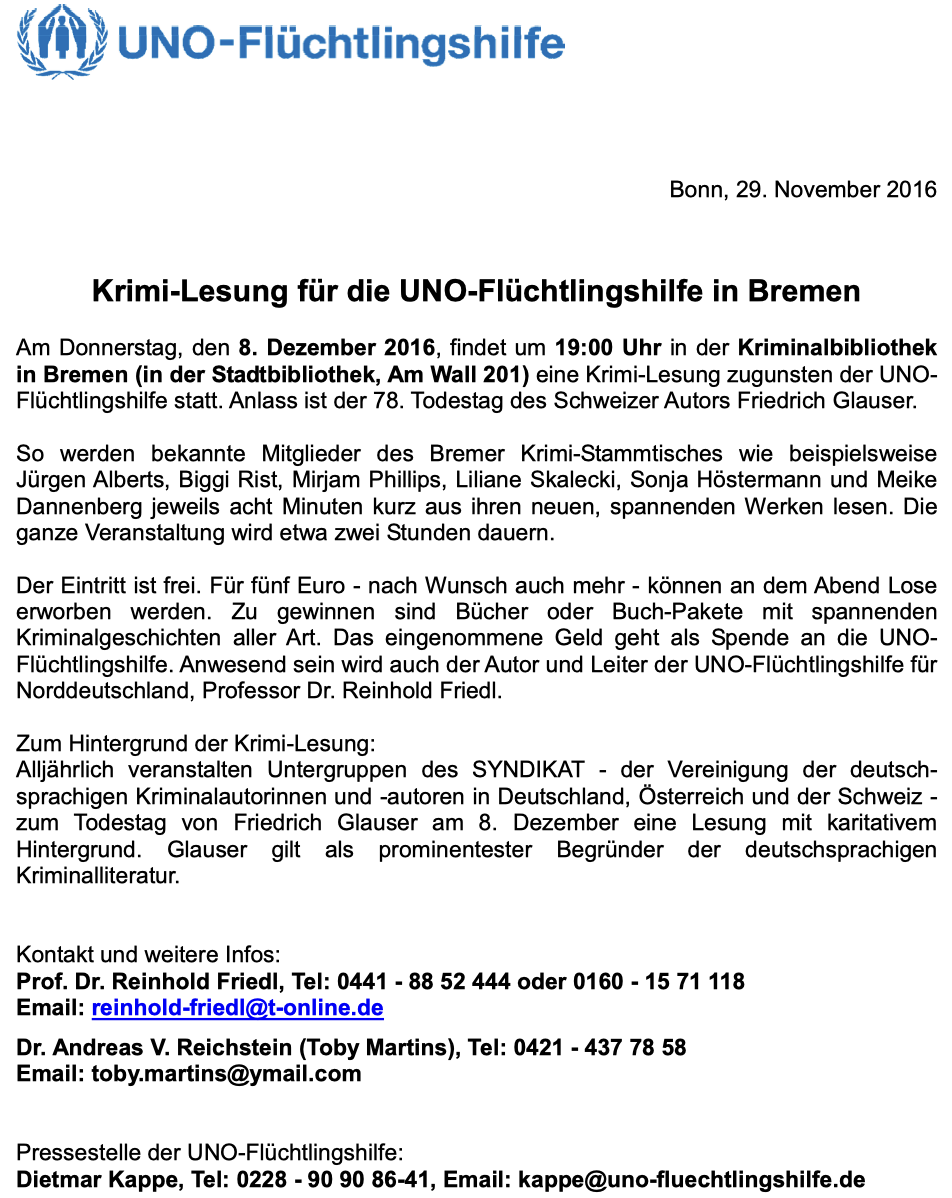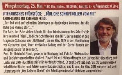 17. Januar 2015, 15.00 Uhr. "Wohnzimmerlesung". Reinhold Friedl liest aus "Tödliche Schriftrollen vom Nil" und anderen Werken. Gastgeberin: Petra Hartung, Barnkruger Str. 57, Drochtersen-Barnkrug, bei Stade.